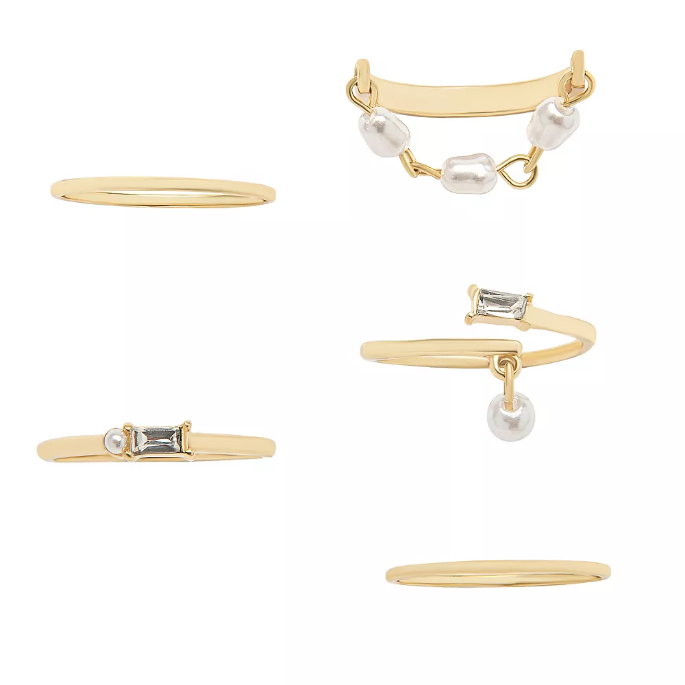 Be set up for fashion success with this LC Lauren Conrad Gold Tone Clear Baguettes and Simulated Pearls Multi Ring Set.