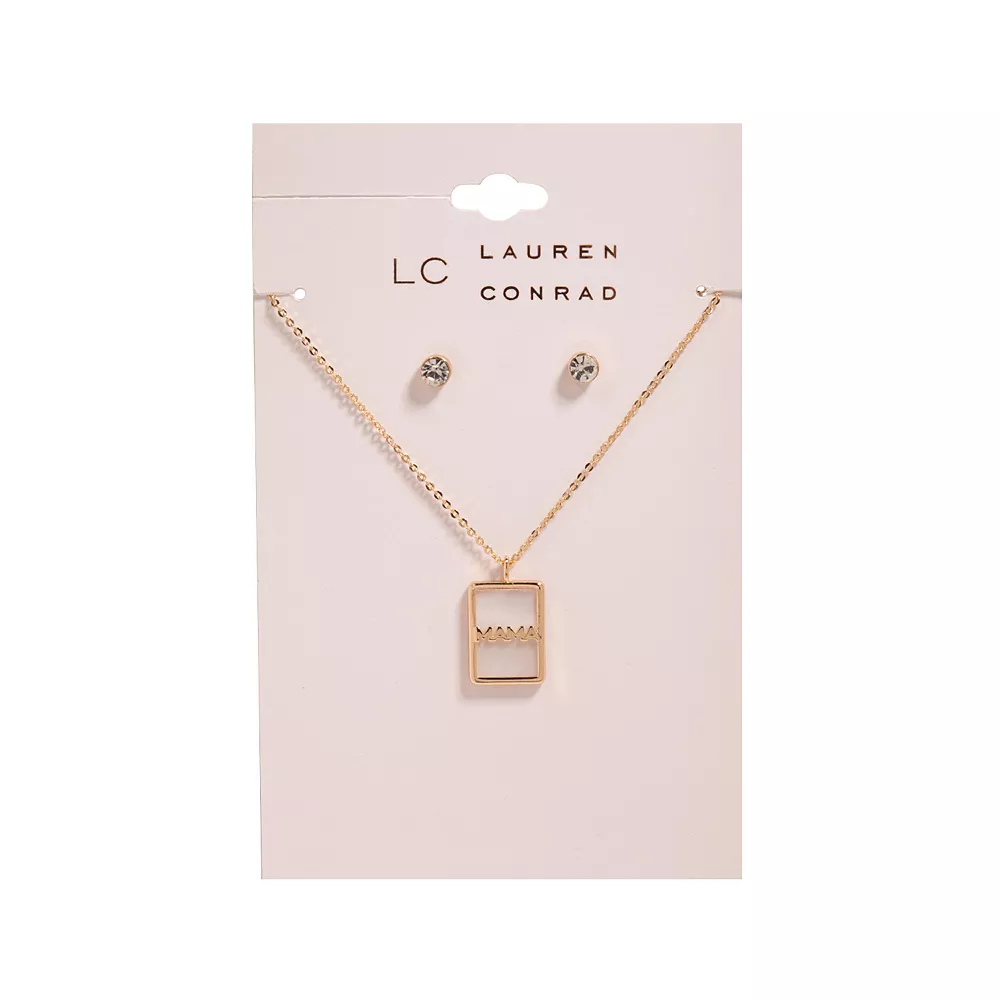 Show her how much she means to you with this sweet gold tone mother-of-pearl “Mama” necklace and crystal stud earrings set from LC Lauren Conrad.