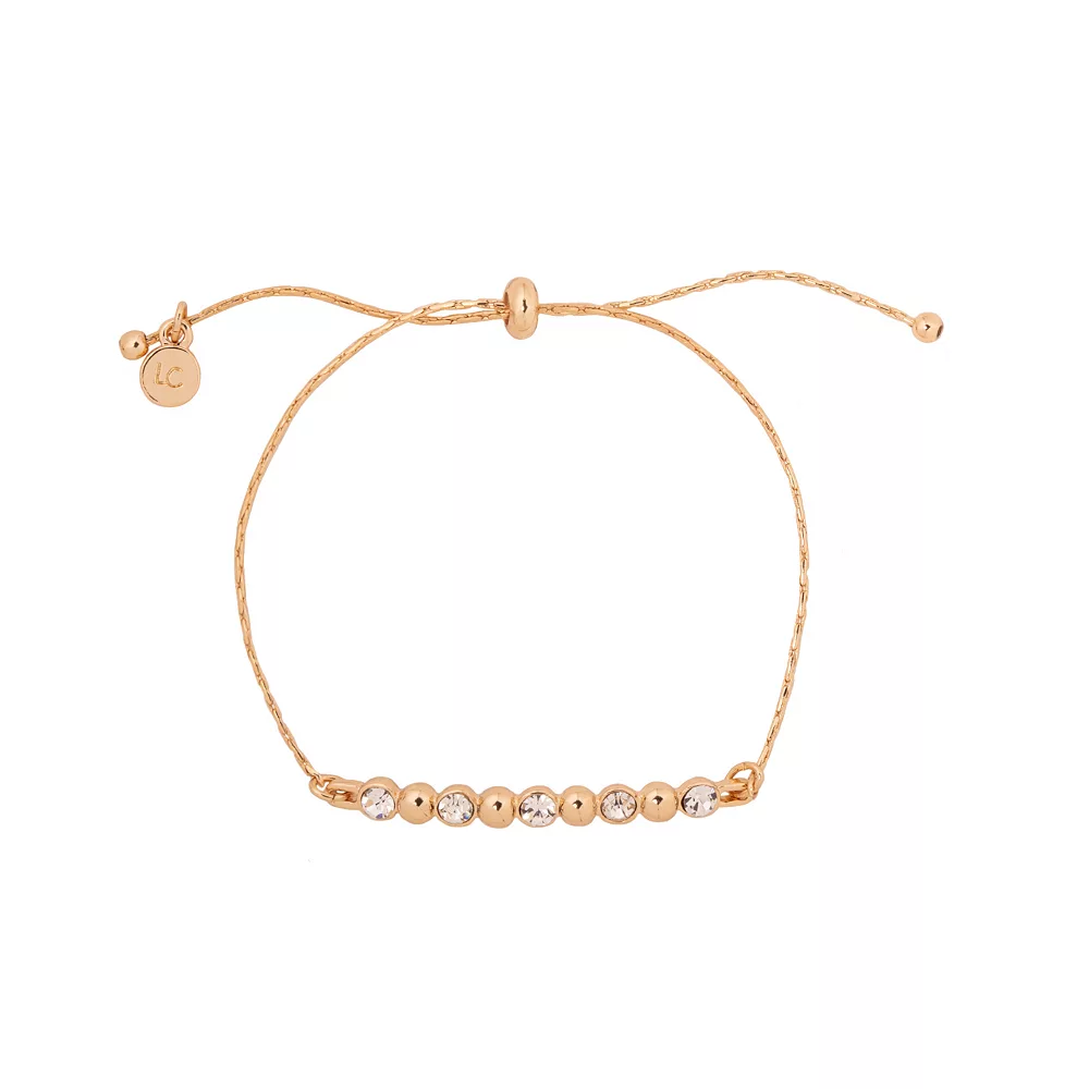 This LC Lauren Conrad Gold Tone Simulated Crystal and Metal Ball Bar Nickel Free Pull Tie Bracelet is full of life and charm.
