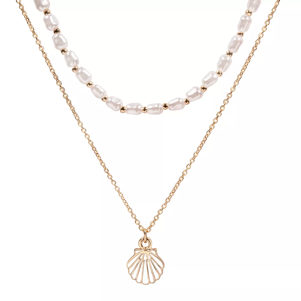 Give your jewelry collection a tropical refresh with this simulated pearl and gold tone shell pendant double-strand necklace from LC Lauren Conrad.