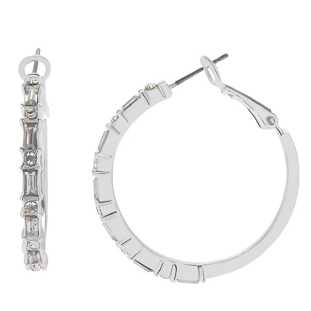 Finish off your look with a touch of sparkle in these silver tone crystal-studded hoop earrings from LC Lauren Conrad.