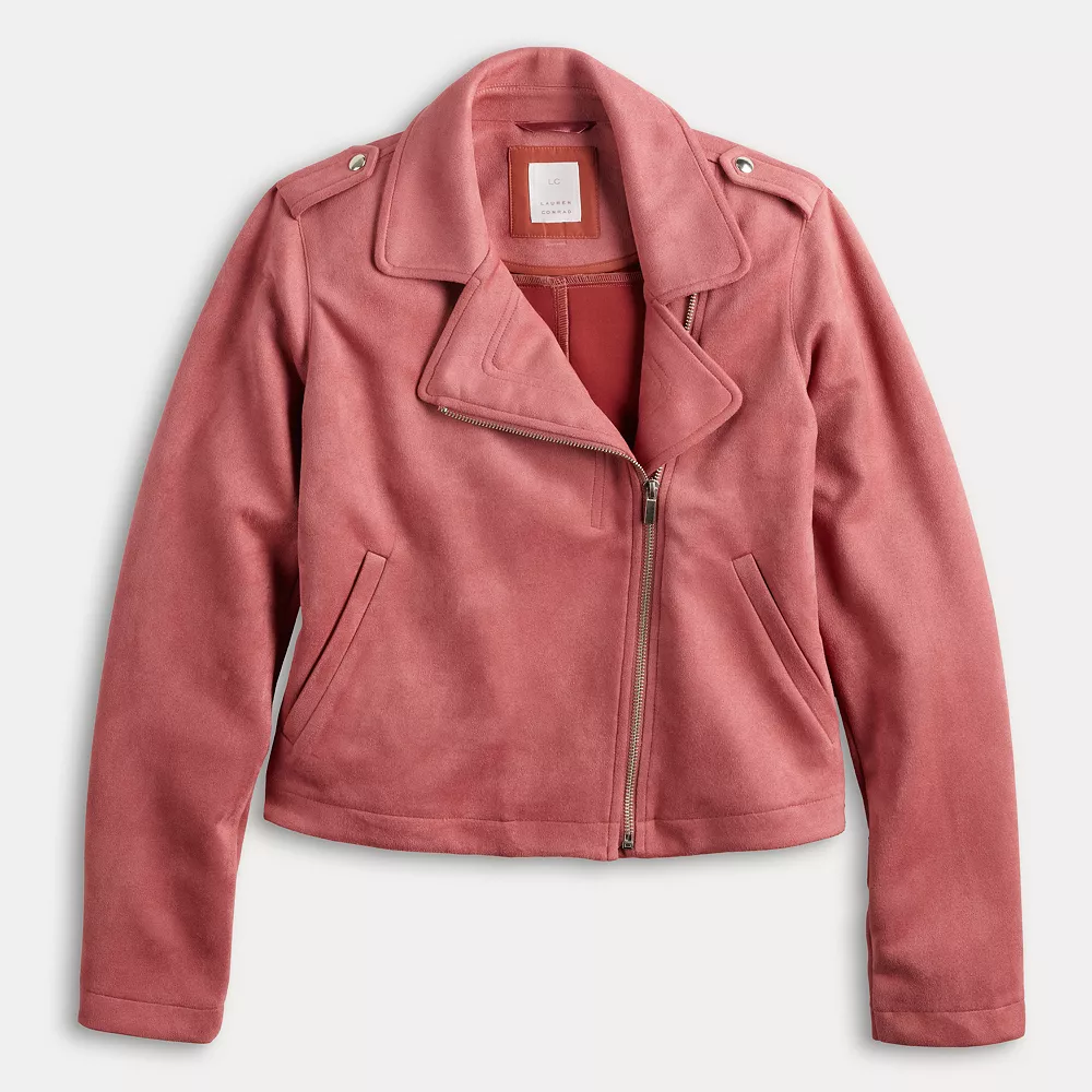 Add an edgy layer to any outfit with this women’s suede moto jacket from LC Lauren Conrad.